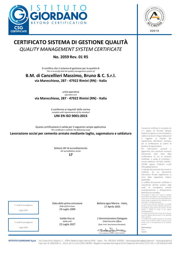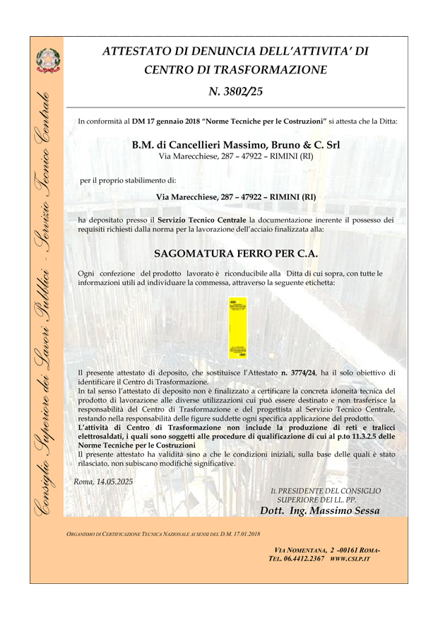 La B.M. opera nel settore del commercio, lavorazione e posa in opera di acciaio da circa 45 anni. Leader di zona nel suo moderno ed attrezzato stabilimento dispone di macchinari all'avanguardia per il taglio, la sagomatura e la saldatura.